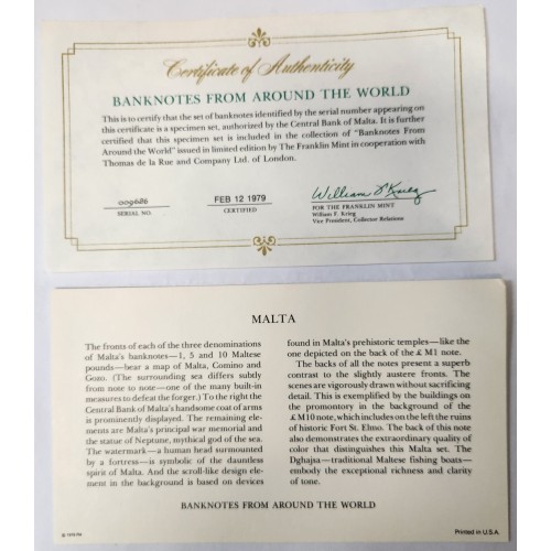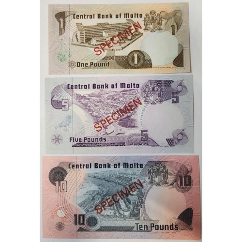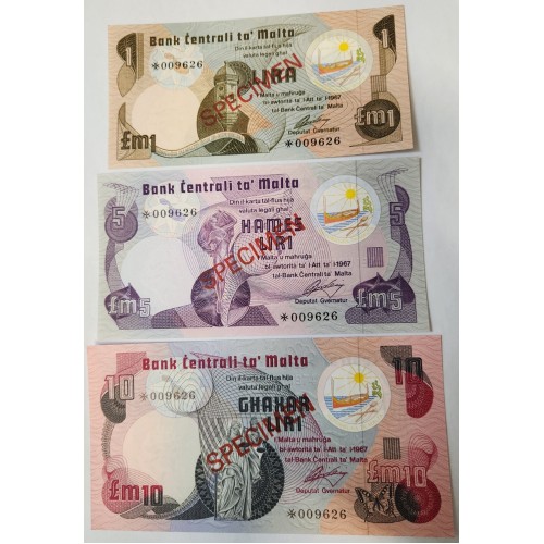 Malta 1967 One 1, Five 5, Ten 10 Lira Banknotes. Specimen. Set of 3 Notes.
