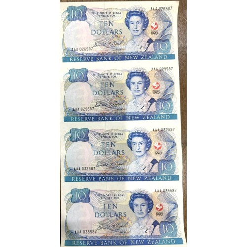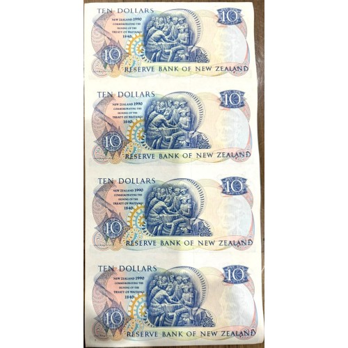 New Zealand 1990 Ten 10 Dollars Banknotes. Sheet of 4. AAA Prefix.