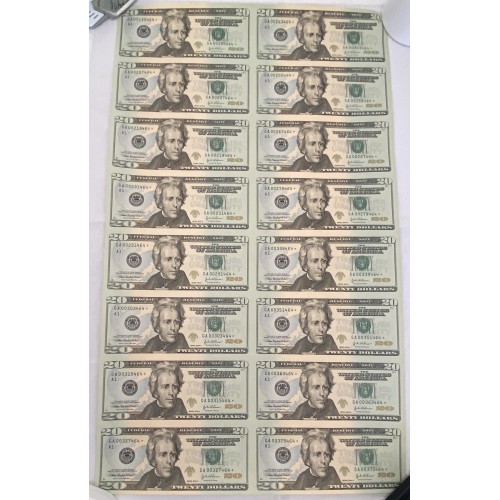 United States of America 2004 Twenty 20 Dollars Banknotes. Sheet of 16. Uncut