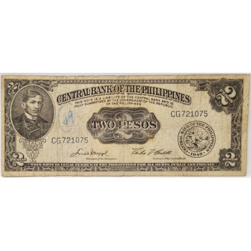 Philippines 1949 Two 2 Pesos Banknote. Serial: CG721075. Error. Off Centre