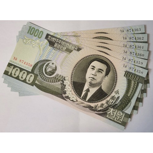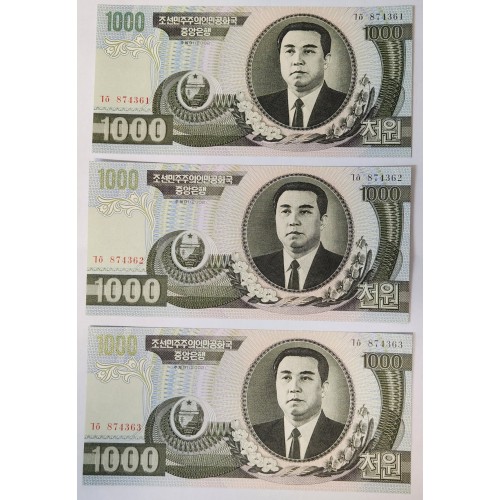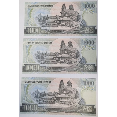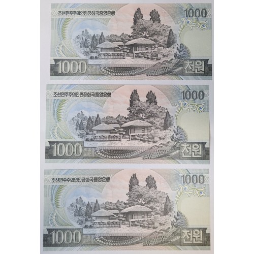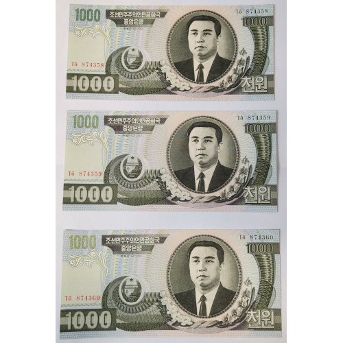 North Korea 2002 One Thousand 1000 Won Banknotes. Consecutive Six.