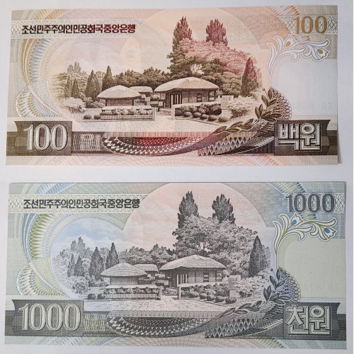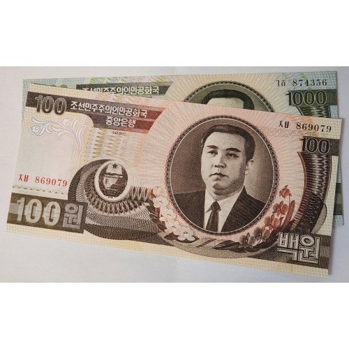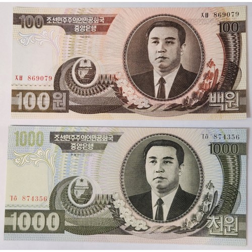 North Korea 1991 / 2002 One Hundred 100 and One Thousand 1000 Won