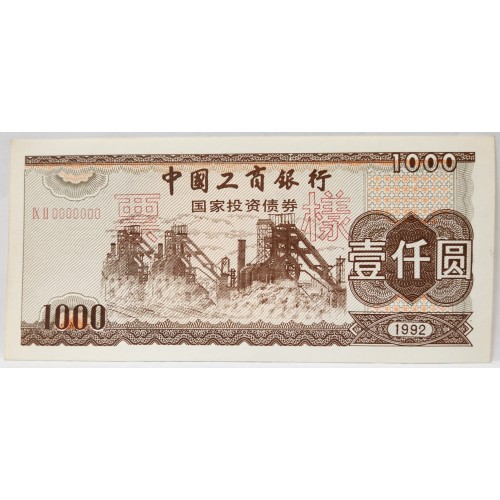 CHINA 1992 . ONE THOUSAND 1,000 YUAN BANKNOTE . SPECIMEN