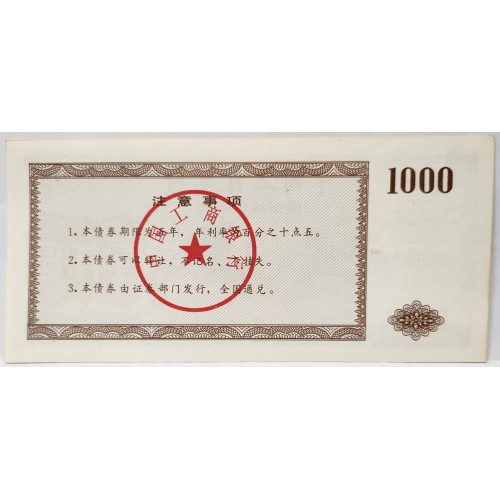 China 1992 One Thousand 1,000 Yuan Banknote. Serial: IX II 0000000.