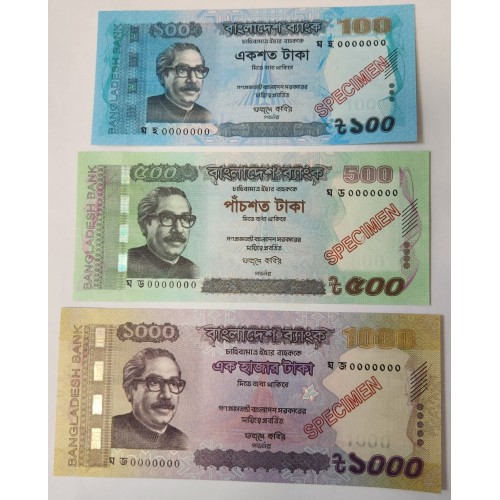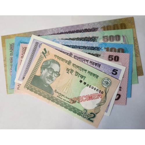 and One Thousand 1,000 Taka Banknotes. Serial: 0000000. Specimen. Set of 6