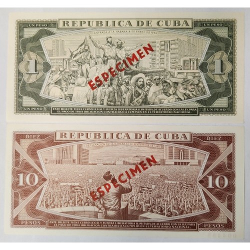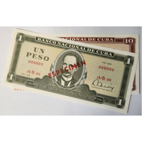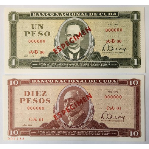 CUBA 1978 . ONE 1 and TEN 10 PESOS BANKNOTES . SPECIMEN