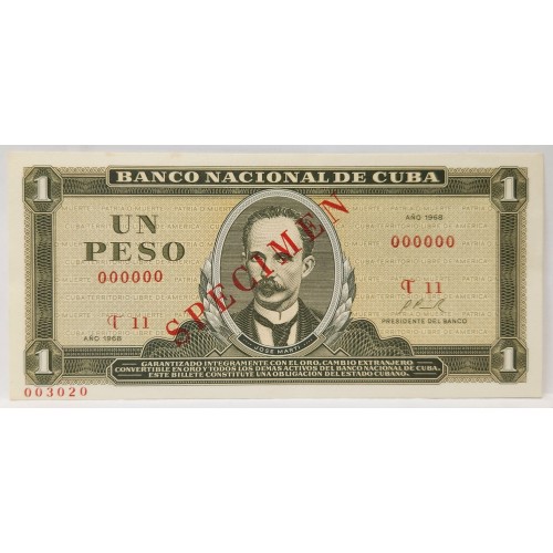 Cuba 1968 One 1 Peso Banknote. Serial: T11 000000. Specimen. Uncirculated